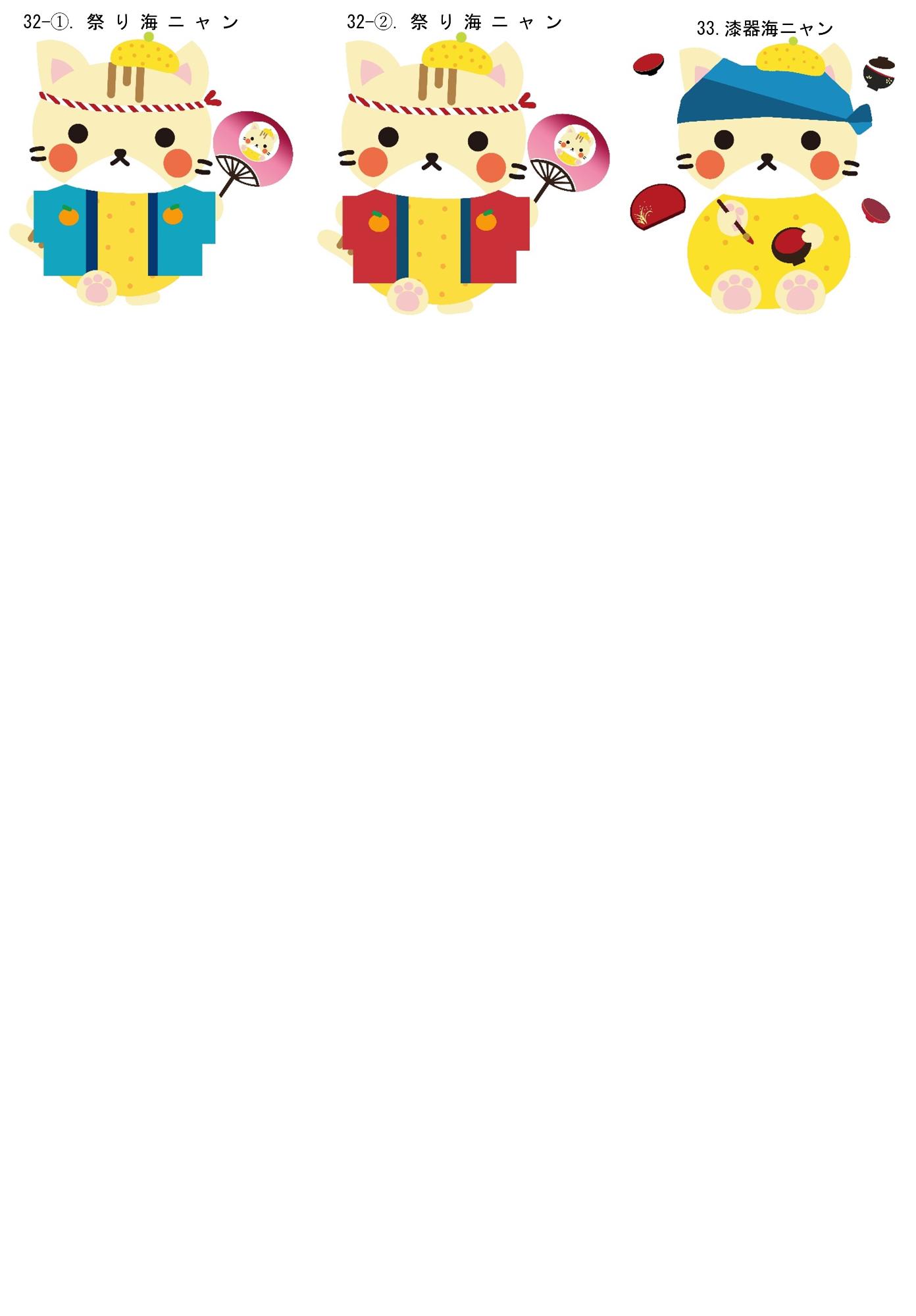 - 「海ニャン」のデザインを使用の際は、海南市をPRするキャラクターであることがわかるよう、基本的には「海南市PRキャラクター『海ニャン』」と表記してください。