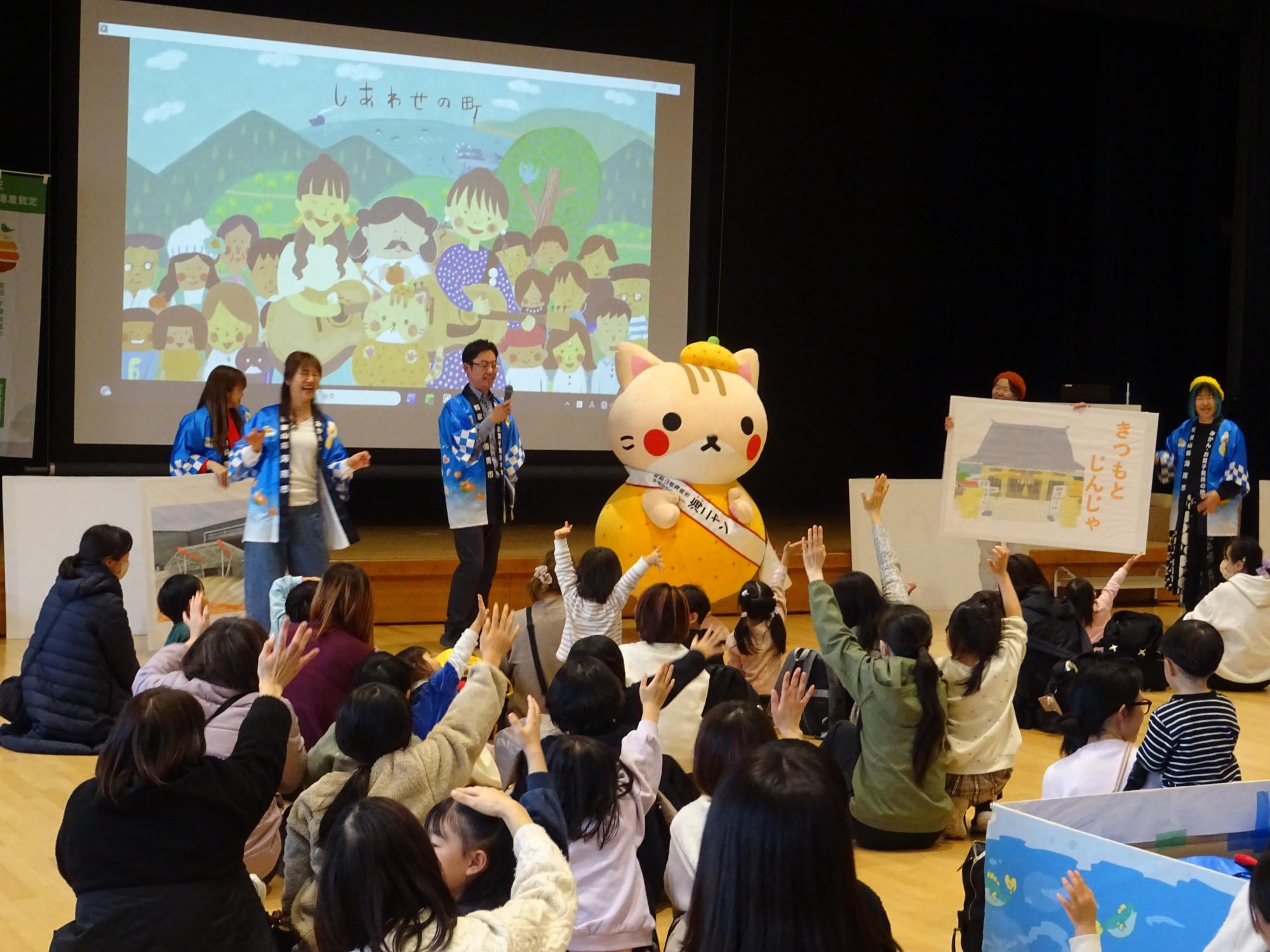 海南市が「お菓子発祥の地」と言われるようになった「たちばなとお菓子のものがたり」を紙芝居で教えてもらったニャ〜