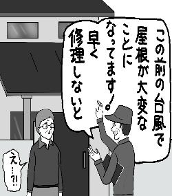 台風や大雨、地震等が発生すると、災害に便乗した悪質商法のトラブルが多くなる傾向があります。「直さないと大変なことになる」「早くしたほうがいい」などと不安をあおり、急かされて契約にいたる手口がみられます。