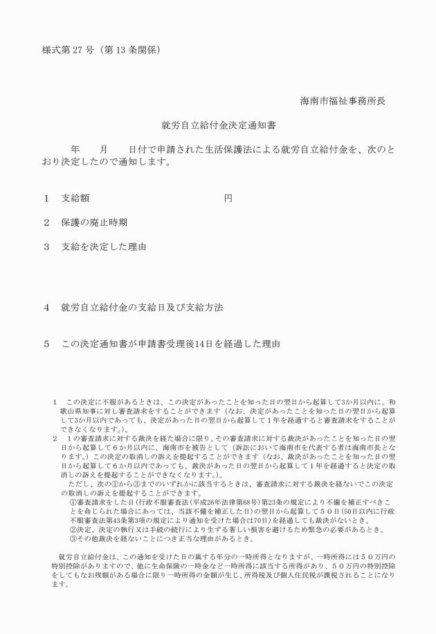 第13条 法第55条の4第1項の規定により就労自立給付金を支給するときは、様式第27号により通知するものとする。