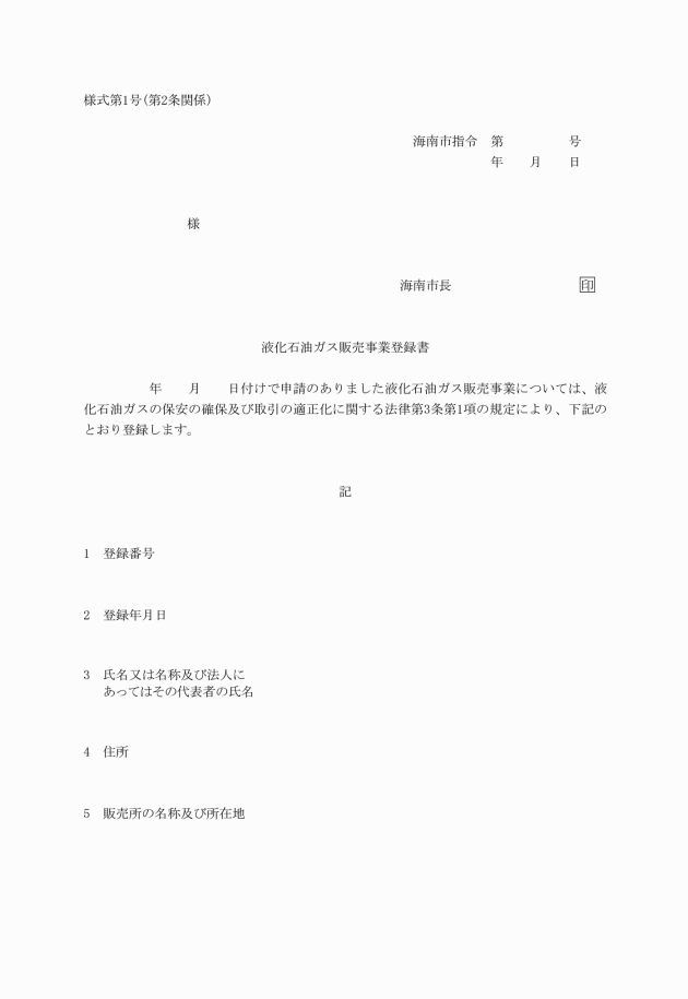 第2条 法第3条第1項の規定により海南市にのみ販売所を設置して液化石油ガス販売事業の登録を受けようとする者は、申請書2部を、消防長を経て市長に提出しなければならない。