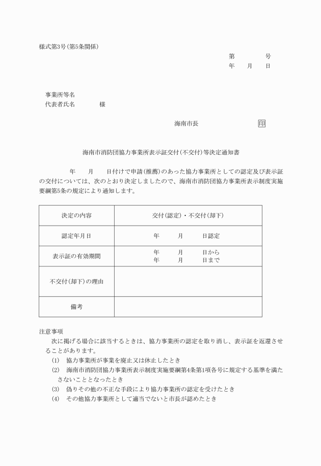 第3条 協力事業所の認定及び表示証の交付を受けようとする事業所等は、海南市消防団協力事業所表示申請書(様式第1号)により市長に申請を行うものとする。