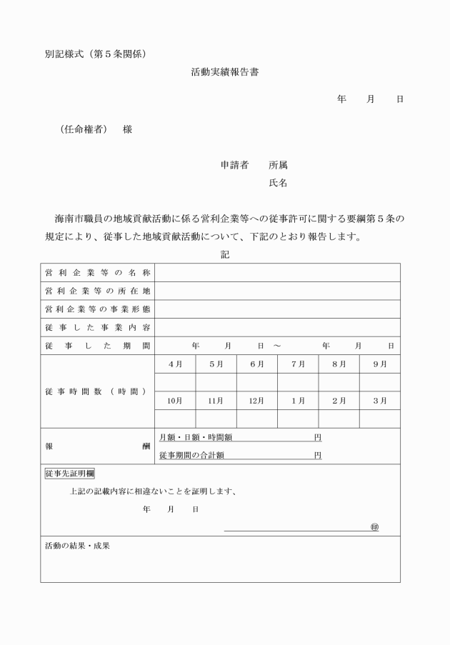 第5条 許可を受けた者は、活動終了後1月以内(複数の年度にわたり同一の活動を行う場合にあっては、当該年度の翌年度の4月末日まで)に活動実績報告書(別記様式)を任命権者に提出しなければならない。